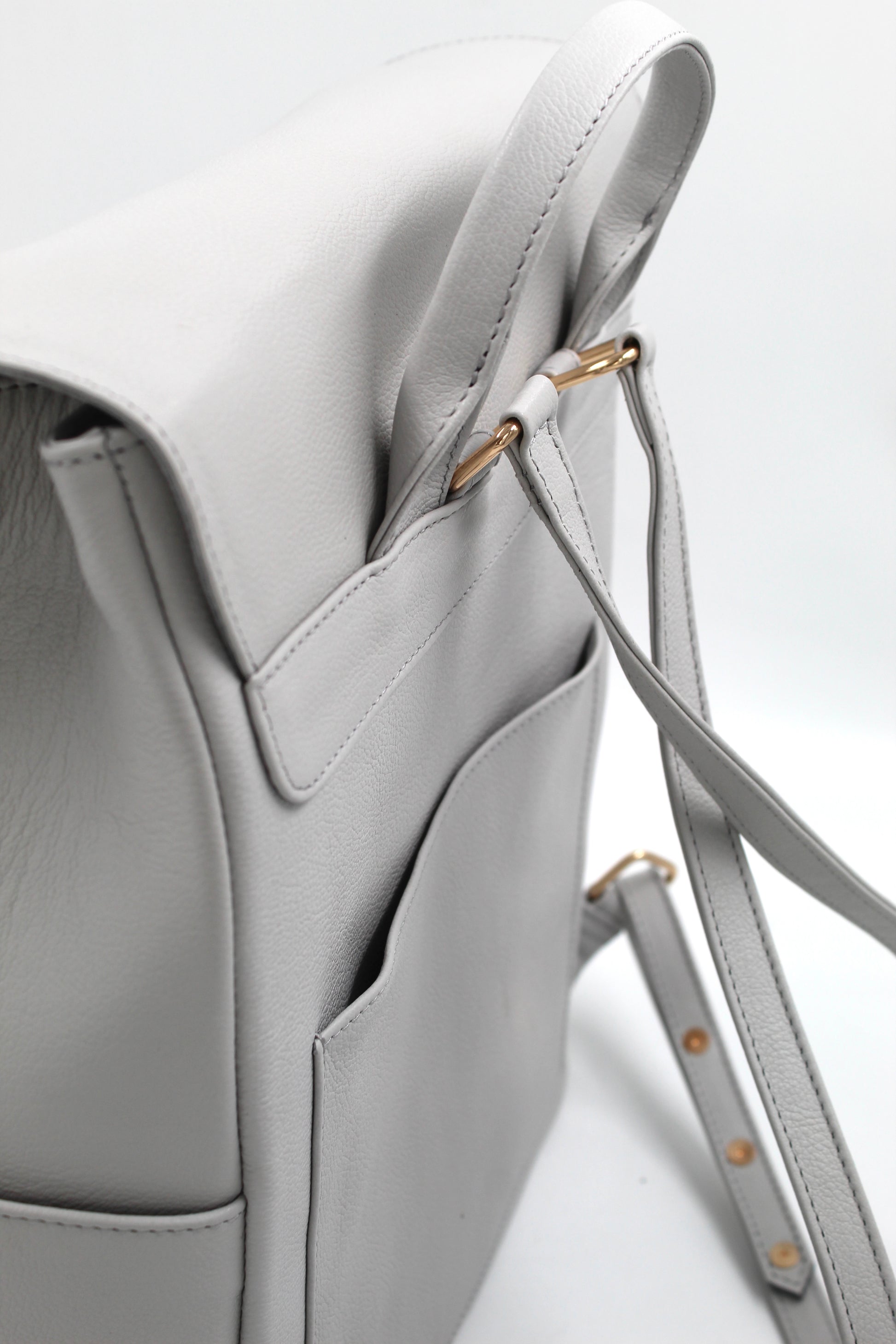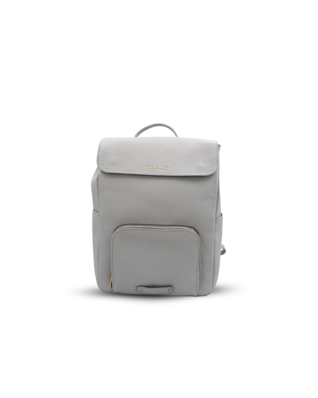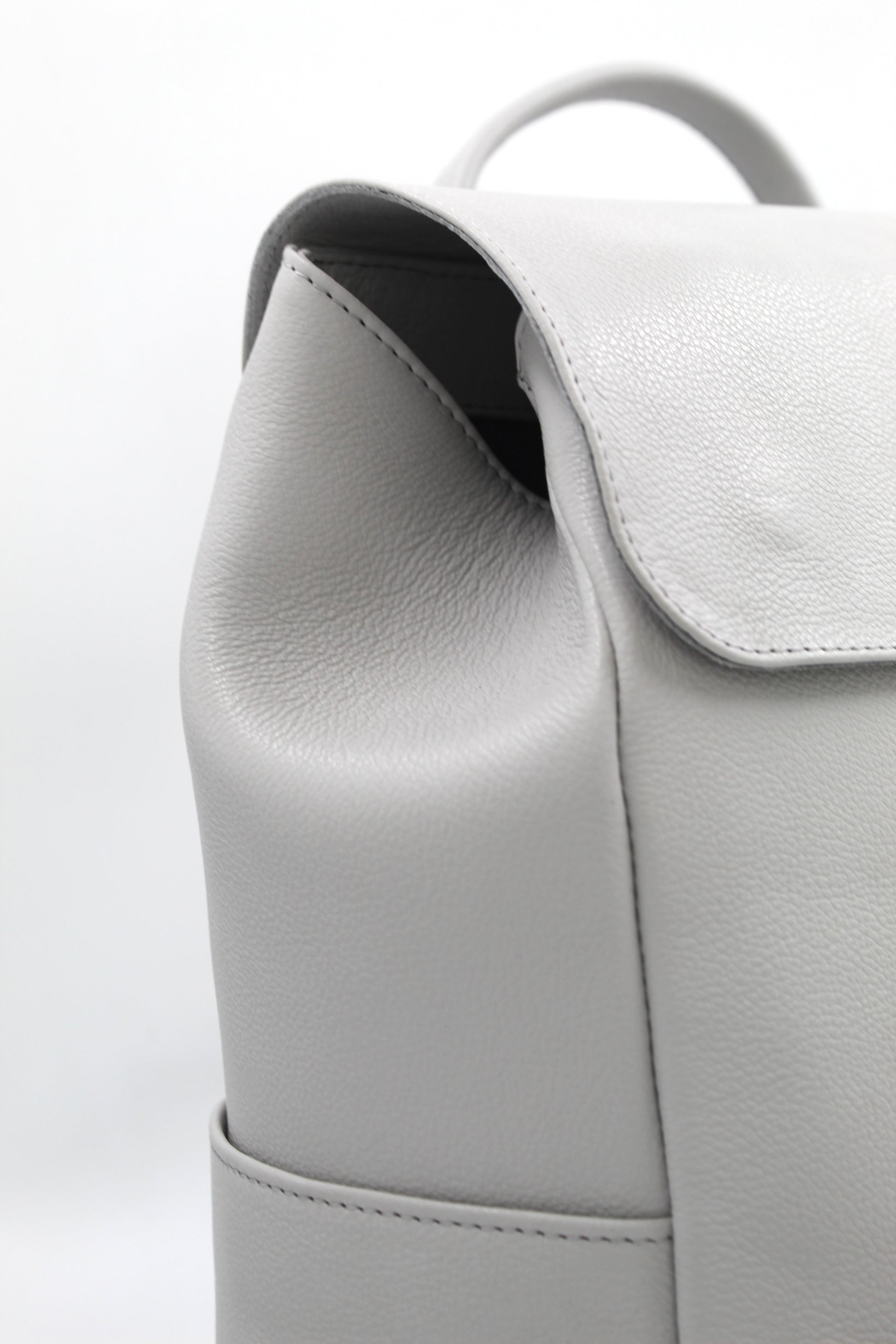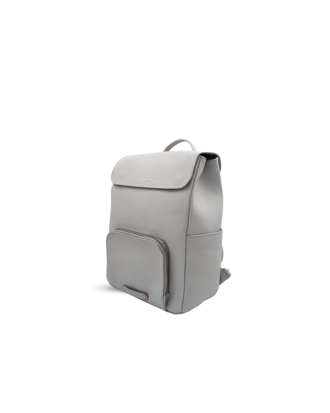 Piel 100% genuina en tono gris, con dos compartimentos laterales y uno exterior con cierre.