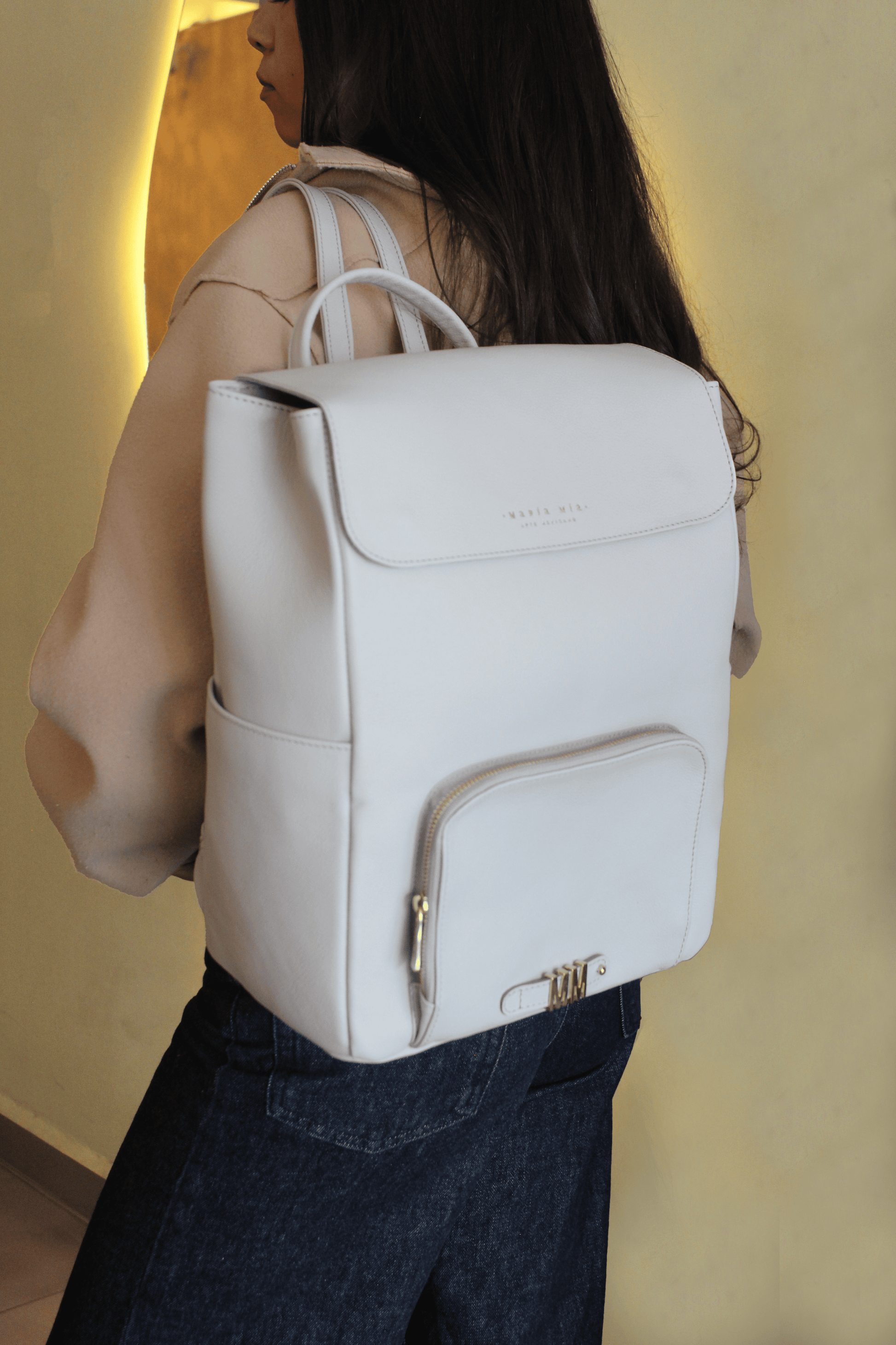 Broche de imán en la parte superior y dos asas traseras para llevarla como mochila.
