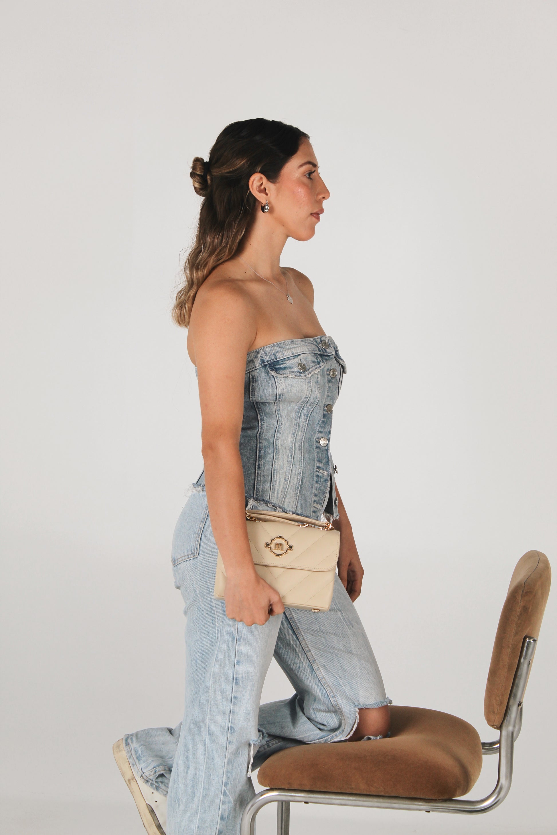Piel 100% genuina, con cadena ajustable para hombro o cruzado.